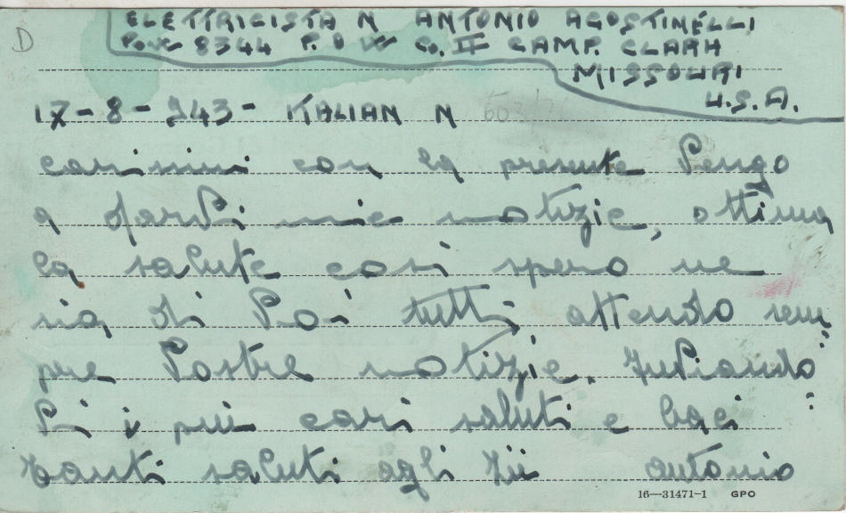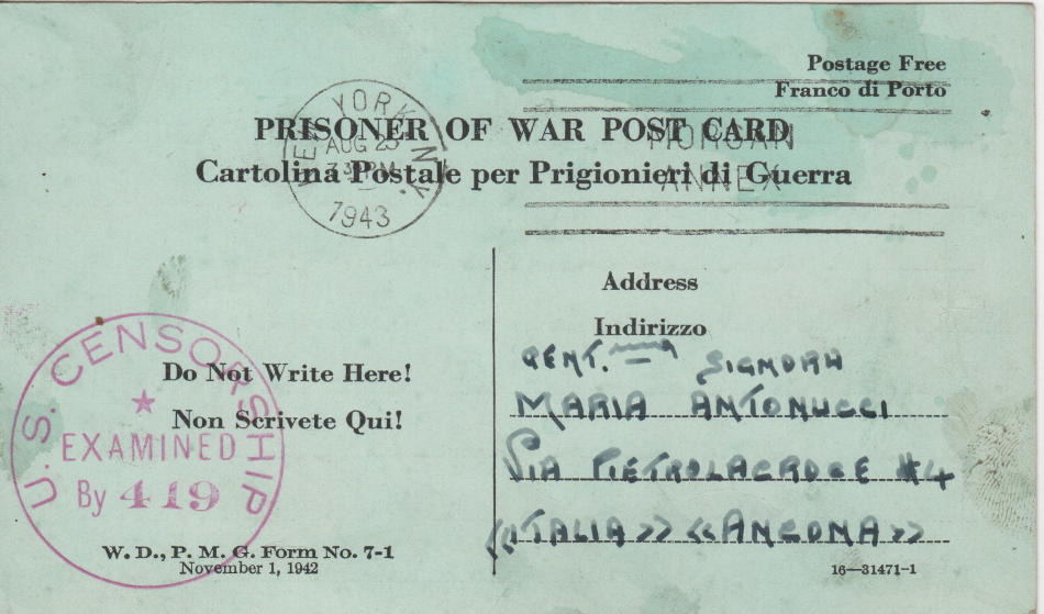 Cartolina scritta il 17.8.1943 nel campo di prigionia e spedita in Italia a Ancona