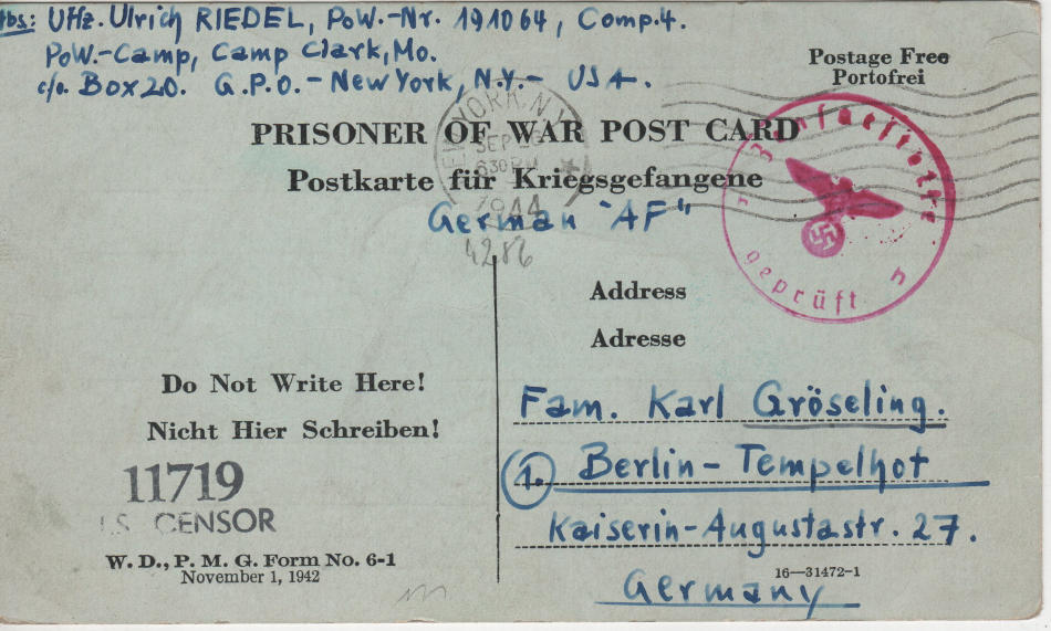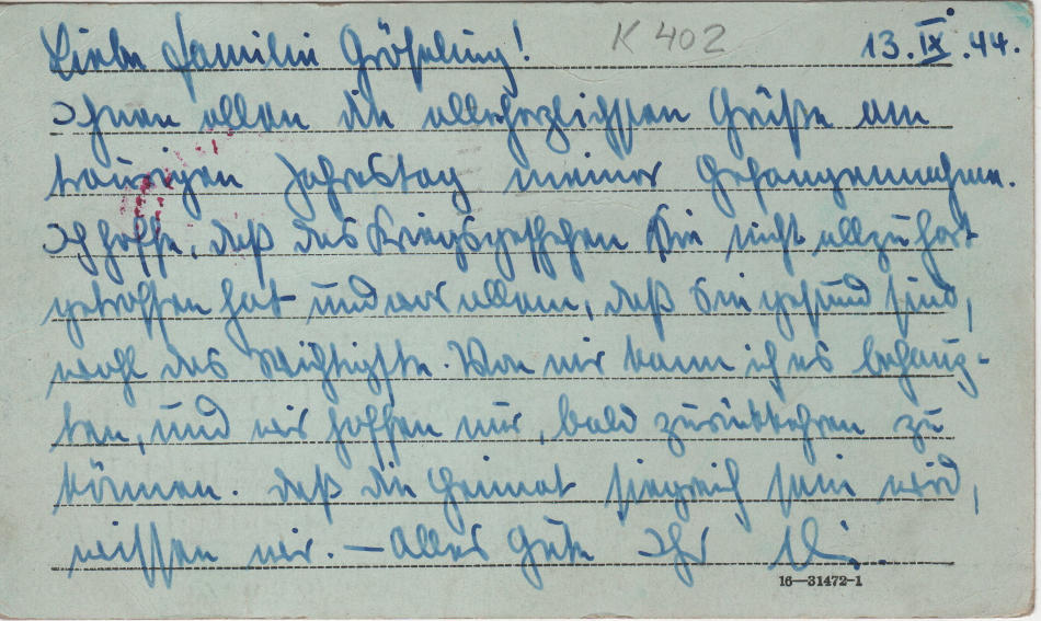 Cartolina scritta il 13.9.1944 nel campo di prigionia e spedita in Germania a Berlino