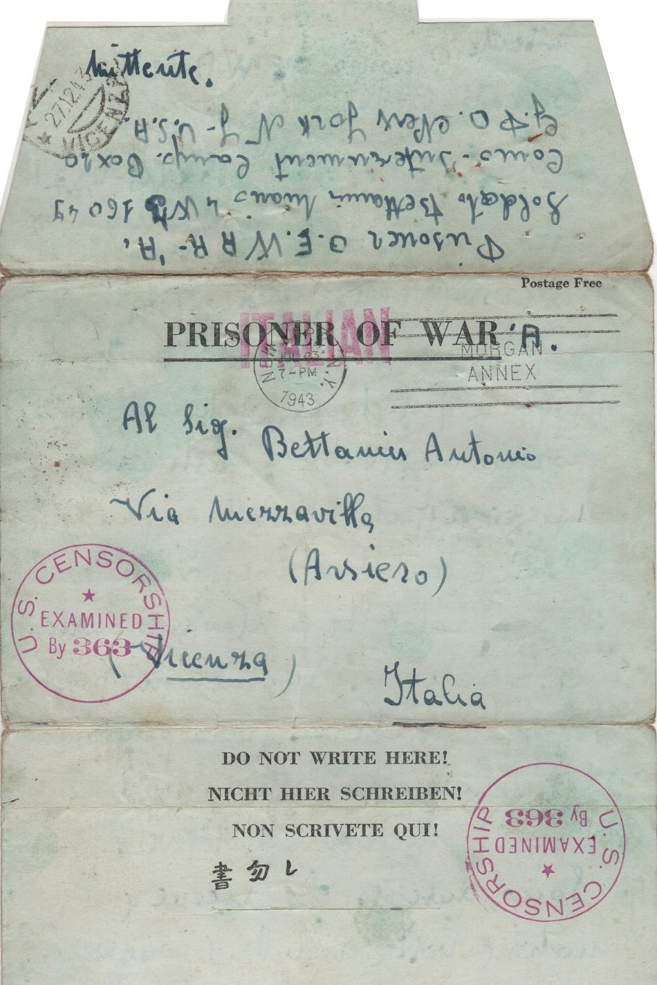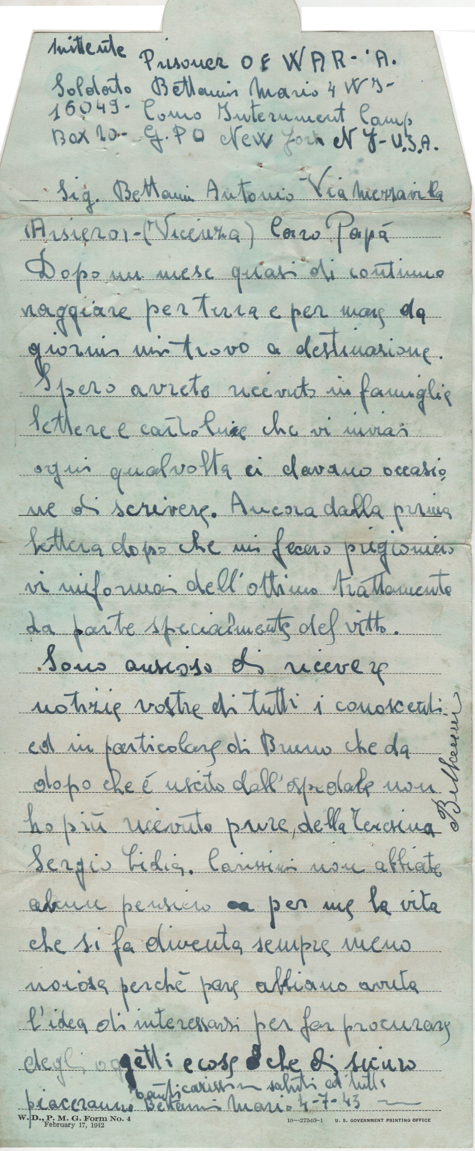 Lettera scritta il 4.7.1943 nel campo di prigionia e spedita ad Arsiero (provincia di Vicenza) in Italia