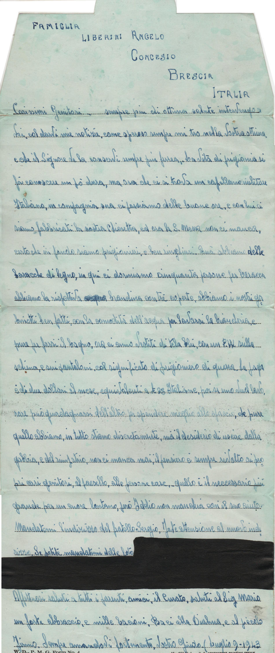 Lettera scritta il 9.7.1943 nel campo di prigionia e spedita a Brescia in Italia