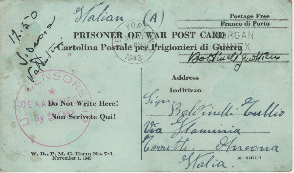 Cartolina scritta il 2.9.1943 dal campo di prigionia e spedita in Italia a Ancona