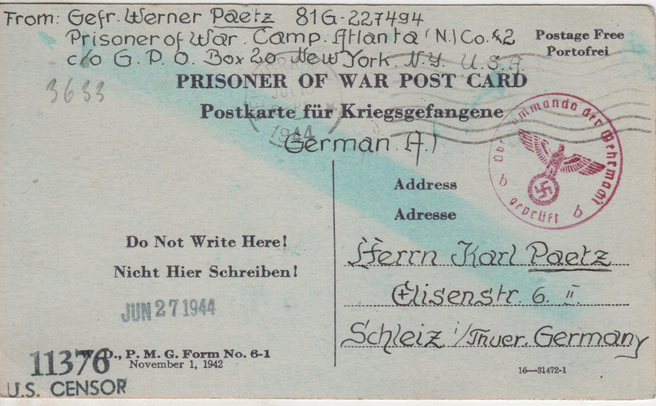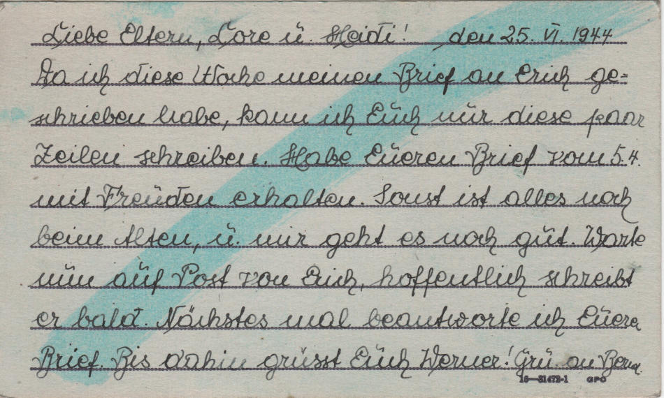 Cartolina scritta il 25.6.1944 nel campo di prigionia e spedita in Germania a Schleiz, nella Turingia