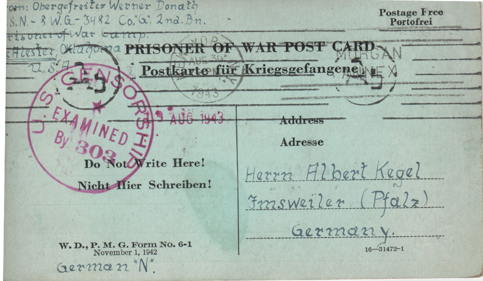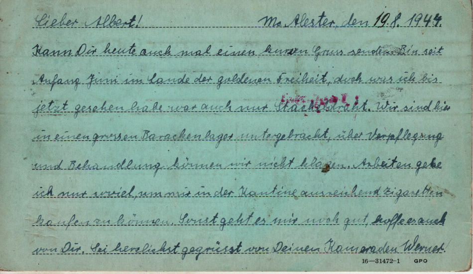 Cartolina scritta il 19.8.1943 nel campo di prigionia e spedita a Imsweiler (Renania Palatinato) in Germania