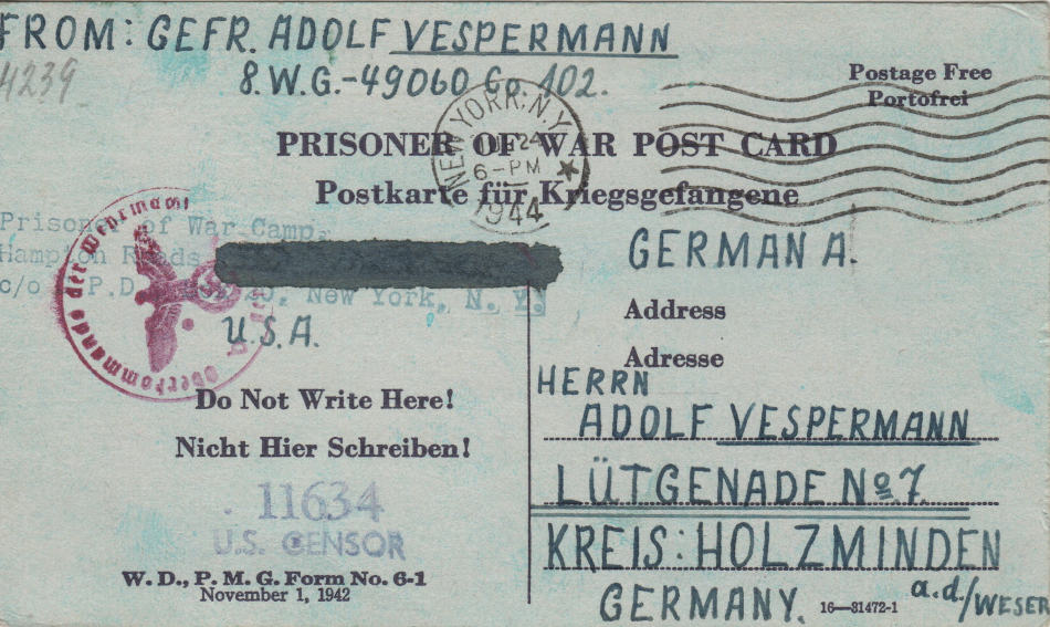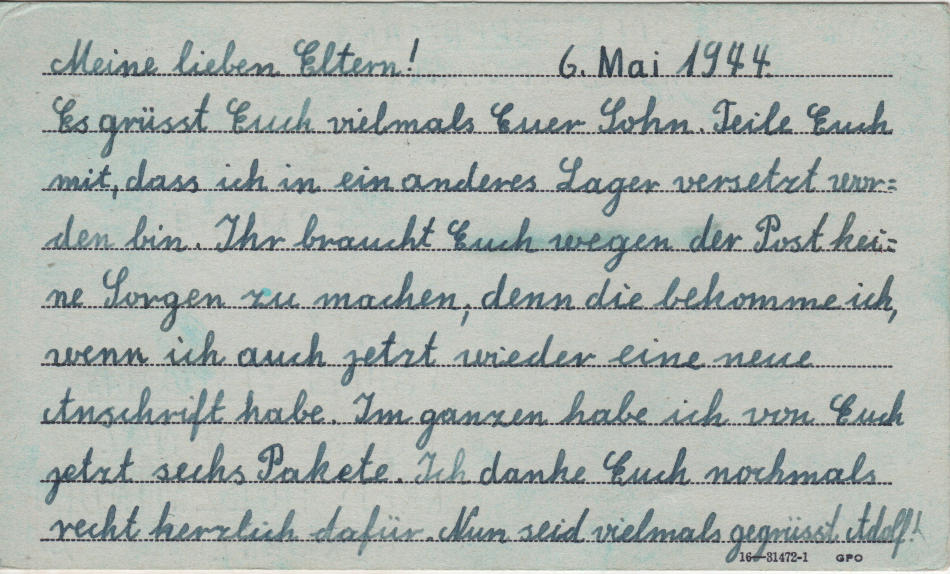 Cartolina scritta il 6.5.1944 nel campo di prigionia e spedita a Holzminden (Bassa Sassonia) in Germania