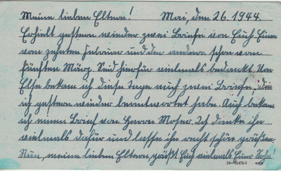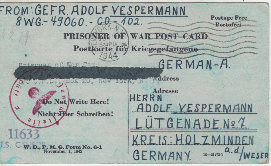 Cartolina scritta il 26.5.1944 nel campo di prigionia e spedita a Holzminden (Bassa Sassonia) in Germania