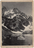 Dopo un vivace battibecco fra alcuni di noi ed il gentilissimo custode, si dà il segnale della partenza. I nostri cacciatori si sperdono fra le ondulazioni della valle: s'ode qualche colpo di fucile che l'eco ripete lontano.... Arriviamo, chiaccherando allegramente, al Lago di Sasso già gelato per metà. Ammiriamo il meraviglioso paesaggio che ci circonda; il Lago, che s'incastra fra due pareti rocciose, è sbarrato a valle da un succedersi di enormi massi bruni che si specchiano cupamente nelle sue acque. Le nubi che sembrano diradarsi lasciano trpelare qualche riflesso di sole che, rischiarando la conca, rende più tenue il colore verde intenso del Lago, e fra di esse intravediamo la vetta nevosa del Pizzo.