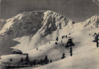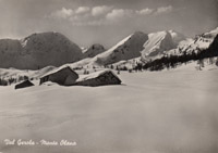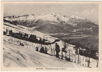 Al Rifugio "Monte Olano": L'eco del richiamo alpino ci giunge a Valle dai bianchi silenzi delle nevi, ci ridesta con una rude carezza, ci accorda le anime, ci accompagna nell'ascesa fino alla meta: ci attende un rifugio montano che non è una meta, ma solo una stazione di partenza. Infatti la neve sciabile la ritroviamo appena lassù, fra la verde cornice degli abeti e torna a brillare nell'oro del sole oltre la pineta e l'ombra ospitale del nostro rifugio. Non è una vedetta fra le roccie, ma guarda sul sentiero boscoso e sul declivio di una conca nevosa e ci attende, come un amico, fra il verde cupo e gli spiragli d'azzurro. Eleva una spira di fumo che le altre capanne sparse non svolgono, e ci accoglie con il tepido soffio profumato della resina che vapora dal focolare e dalle brevi pareti rivestite d'abete. Non manca nulla alla rustica semplicità del rifugio e l'alpinista morbegnese può accogliere ogni ospite della valle, ogni baldo camoscio, con la sicura cordialità della tradizione locale. E se l'allegria aumenta c'è un'ala più rustica, rivolta al cuore della pineta che guizza bagliori dalla gran fiamma che arde nel centro e popola le pareti di fumo, di fantasie, di ridde, di suoni, di liete canzoni. Usciamo nel sole chè il canto del sole ci chiama per l'alto cammino! C'è un segno di fede sul rifugio e guarda proprio verso il sole! Quel segno ripete il richiamo alpino e arresta le corse e le canzoni, smorza gli accenti ed i passi e ci raccoglie nella piccola chiesa ove la semplice purezza del rito ci fa l'anima più lieve e ci piega il capo per meglio ascoltare la voce che viene dalle vette con un ritmo alato e si fa sommessa nel religioso silenzio. Lo stesso segno di fede ci schiude un canto migliore e l'ebbrezza che spira dall'anima è il preludio della bianca conquista. Il rifugio attende il nostro ritorno come un vigile all'ombra nell'ora del tramonto. g.p.